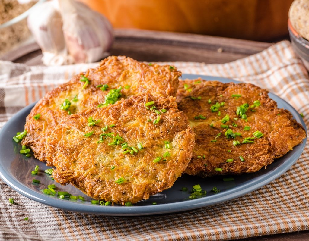 All you do is shred the potatoes, mix them with the other ingredients, and form the mixture into pancake-shaped patties. Last, heat up some vegetable oil in a pan and deep fry, cooking for a few minutes on each side. These pancakes should be crispy on the outside but softer in the middle, like a hashbrown.